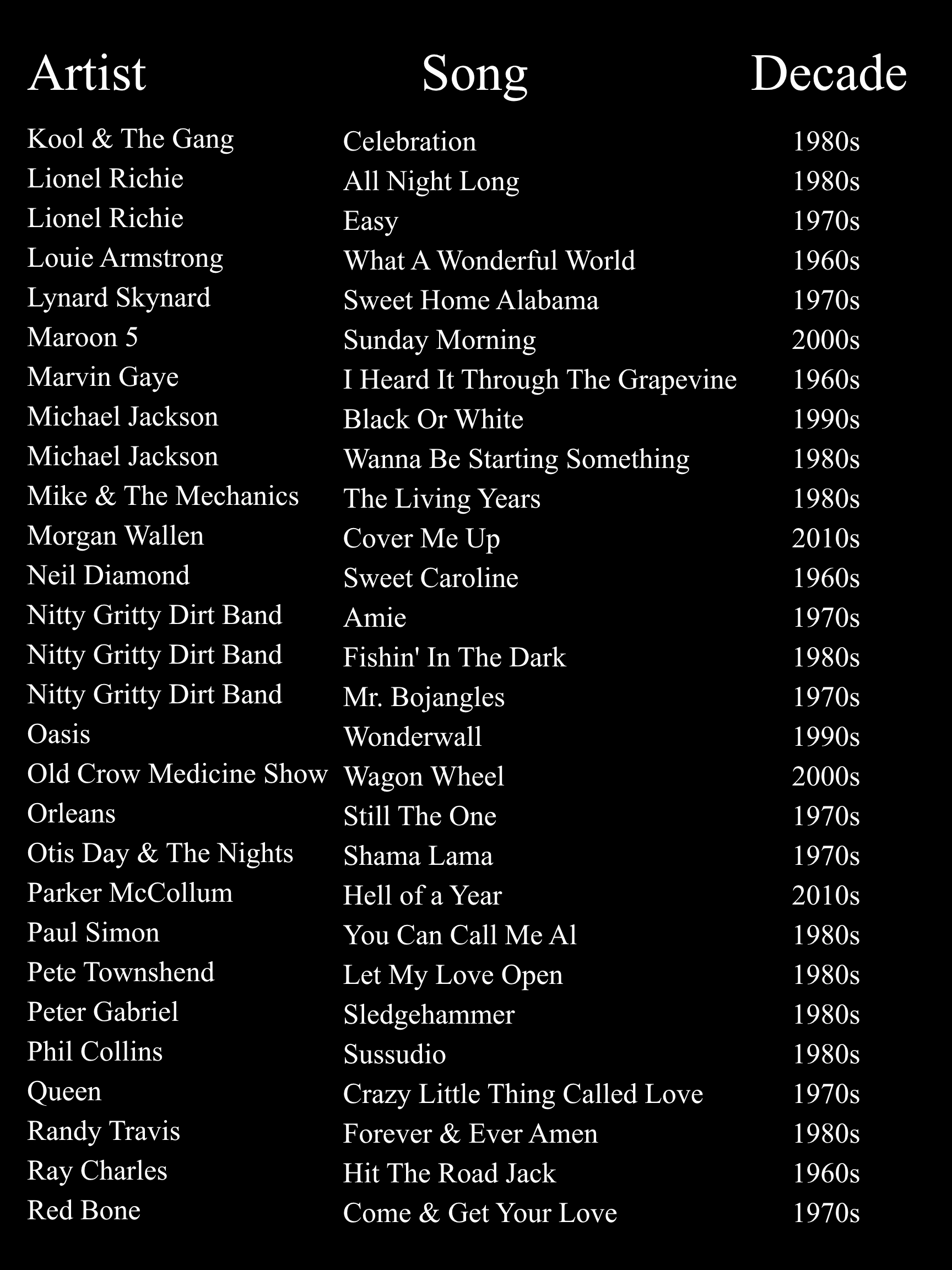 Below are songs we play most often as of late. We do have a full list of over 400 songs, so if you don’t see something below don’t hesitate to ask!